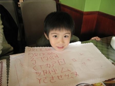 ↑ 凱凱自己練習寫注音符號星期日一起用中餐凱凱自己拿餐墊紙起來寫注音符號老公一直笑著對他說:在家裏都不寫,在外面才要寫後來因為一個「ㄎ」少了一橫被我糾正,還寫顛倒給他看結果凱凱就哭哩...最後只好再遞上一張餐墊紙給他本來還不願意寫,後來老公搶了他的筆他馬上就又搶過去寫了所以寫好時,馬上幫他拍起來~~因為餐墊紙有部份髒污,總不能帶回家吧!