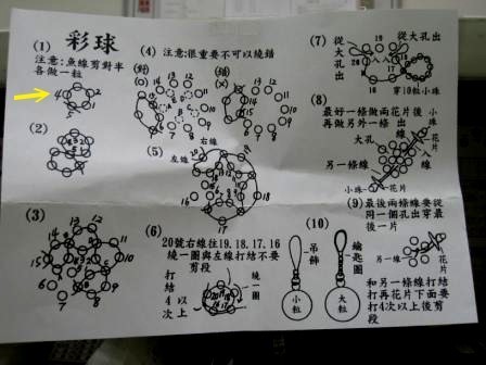 ↑ 材料包的封面↑ 材料包的作法,箭頭處是我目前做到的地方話說我收過喵喵送我的奶油獅所以我以為應該不是很困難再加上非常久遠以前我也曾經自製過一條手鍊...真的只有一條...我昨天前前後後花了快二個小時進度就是黃色箭頭處作法紙上的(2)(3),我完全霧煞煞天啊~~有誰可以救我ㄚ...因為我不止買這這個彩球串珠材料包還買了一個蓮花串珠材料包嗚嗚~~沒事開發自己手殘的地方....